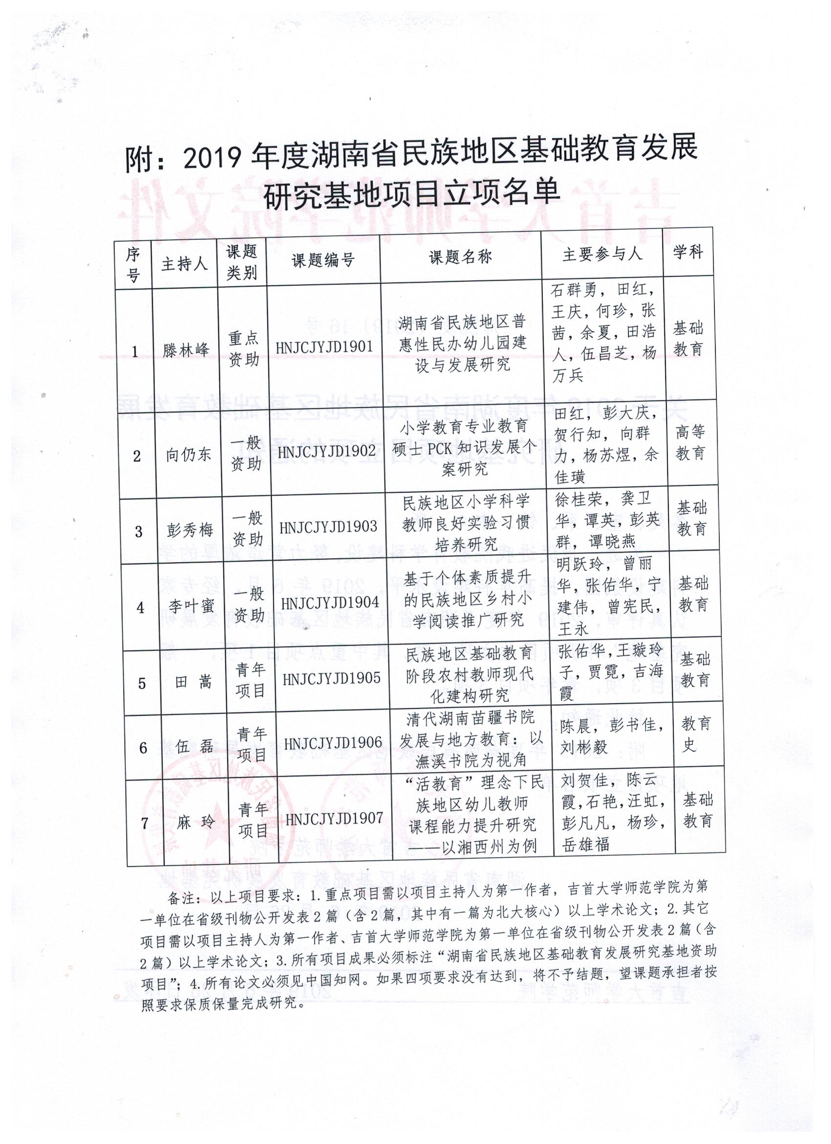 附:2019年度湖南省民族地区基础教育发展研究基地项目立项名单