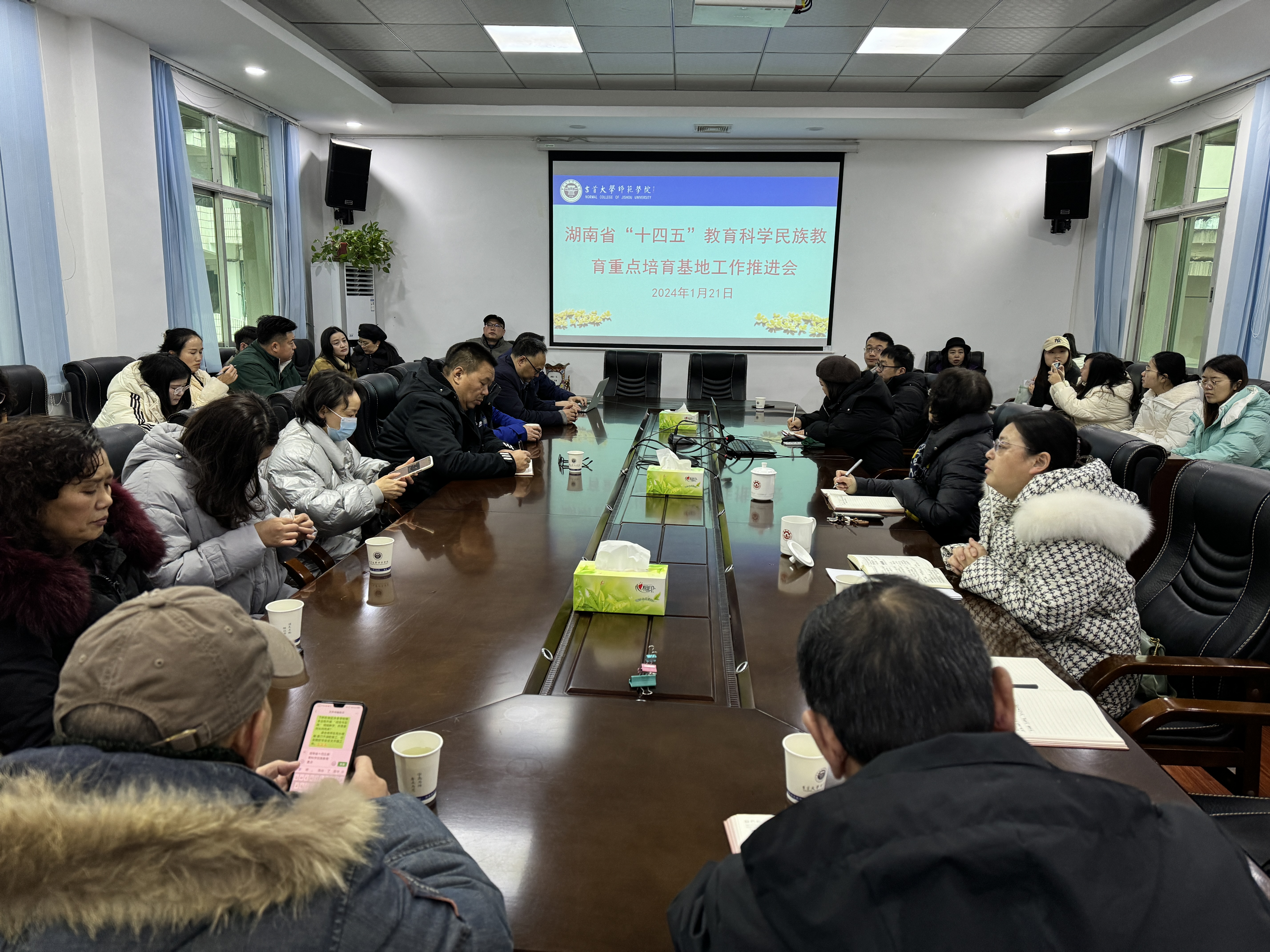 2024年1月21日,公司召开湖南省“十四五”教育科学民族重点培育基地工作推进会。基地首席专家田红教授主持会议,基地负责人石群勇教授、民研所负责人滕林峰副教授,教务科研处主任符智荣副教授等基地主要成员50余人出席。