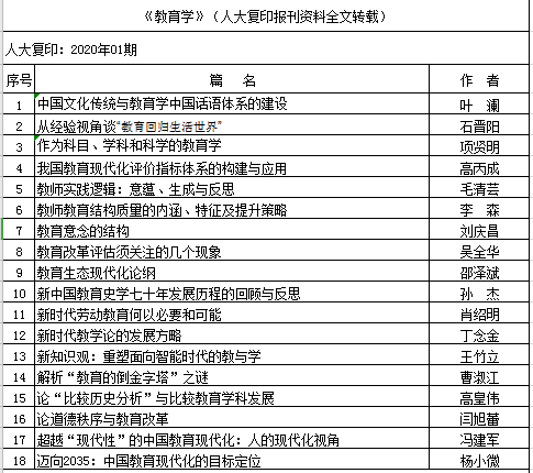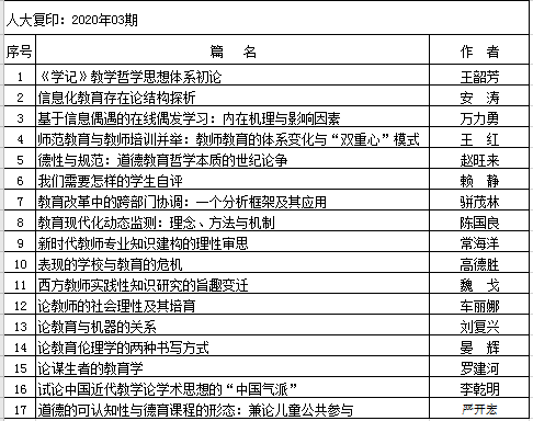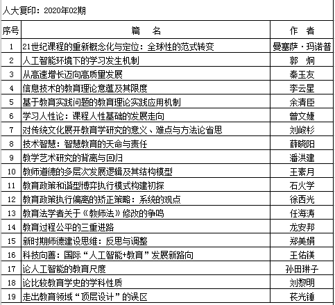 转发:2020年上半年人大复印报刊资料教育学类转载告知(一)