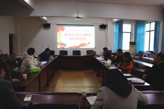 (通讯员:石凤川)为深入贯彻落实党的十九届四中全会精神,2019年12月17日下午,实验设备与评估中心党支部在教育科学研究院305室组织了深入贯彻落实党的十九届四中全会精神宣讲活动。此次活动的宣讲人为实验设备与评估中心党支部蒋林书记,实验设备与评估中心全体党员积极参加。