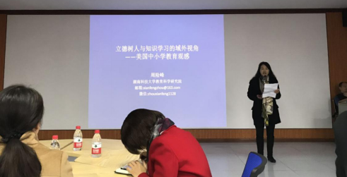 (通讯员:罗夕瑞)2019年11月18日上午十点,湖南科技大学周险峰教授应邀在总理楼60101翻转智慧教室做了一场题为“知识学习与立德树人的域外视角——美国中小学教育观感”的精彩讲座。讲座由教育科学研究院吴青峰副经理主持。教育科学研究院蒋林经理、教科院部分教师、全体研究生以及部分本科生参与了本次讲座。