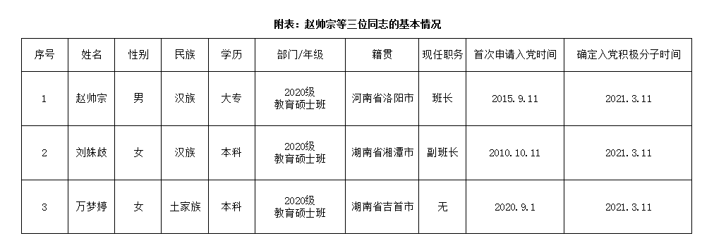 经2022年4月12日支部大会讨论,同意接收赵帅宗、刘姝岐、万梦婷3位同志为发展对象,拟报上级党委审批,现予以公示。(3位同志简要情况见附表)