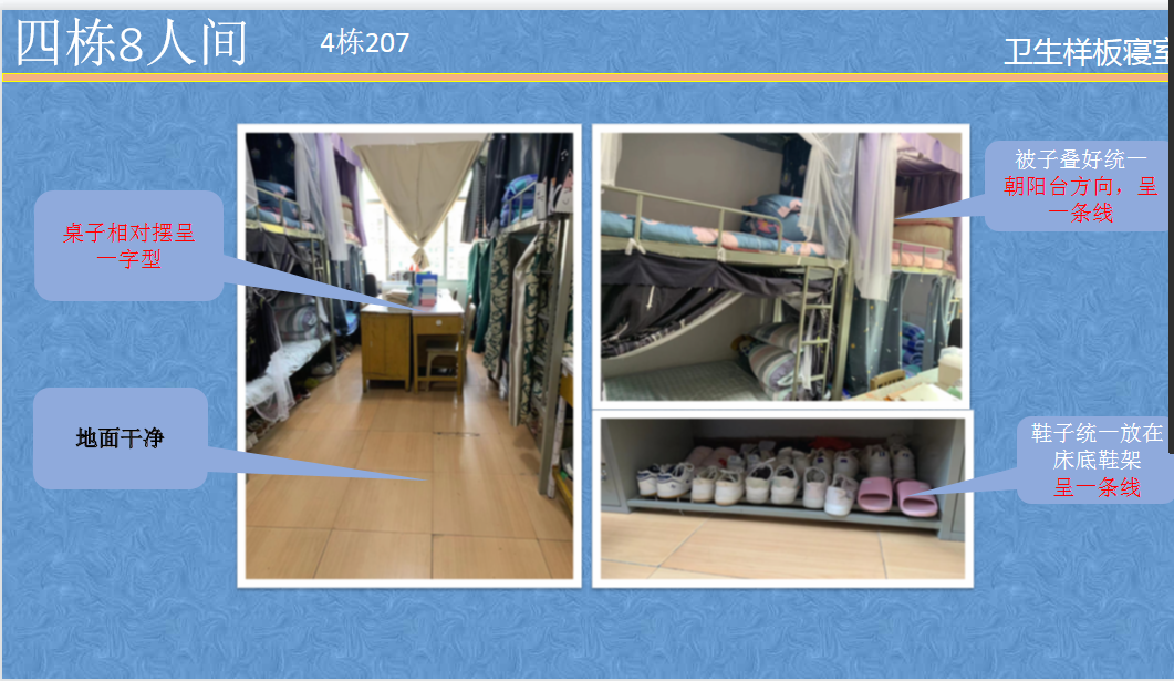 寝室是我家,爱护卫生靠大家。公司举行了寝室内务大整改活动。推出了系列的寝室样板间,鼓励同学们养成讲文明、讲卫生的好习惯。群策群力共建文明宿舍,同心同德共创美丽校园。