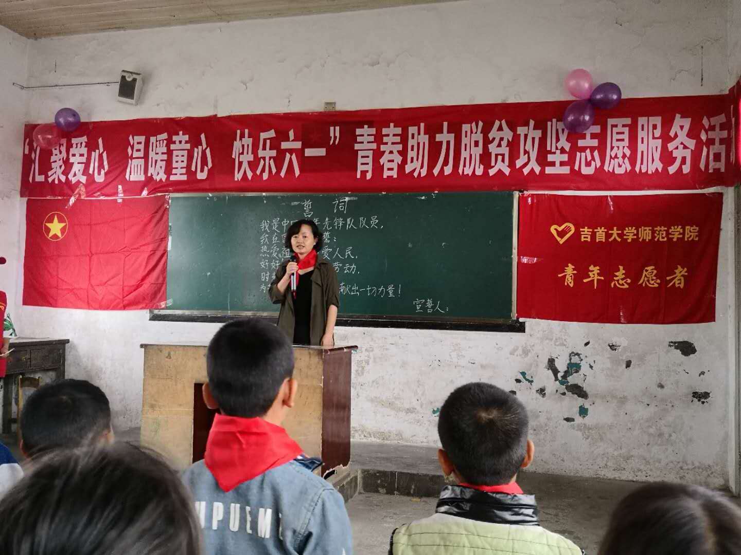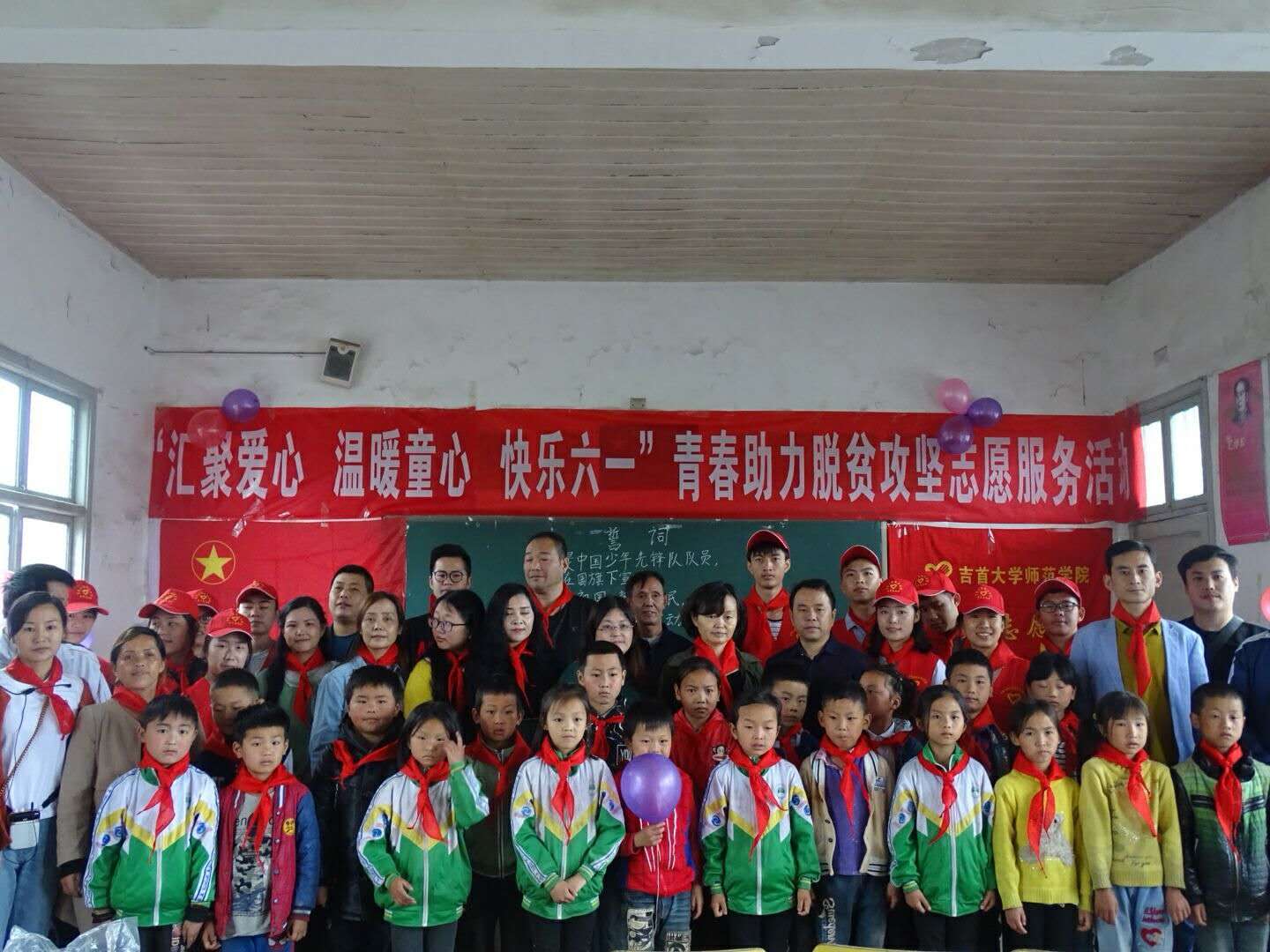 六月是变幻的季节,像万花筒绚烂多姿,像火烧云变化万千,像一场甜美而又飘渺的梦。本次活动我们给花垣县石栏镇排乍村小的孩子们带去欢乐,和他们共度一个快乐的六一儿童节,即使天公不作美,天上下着雨,也不能阻挡我们要去和小朋友一起过节日的决心。按时整队出发,布置活动教室、宣誓、发物资、和小朋友们互动做游戏,一切都按照计划一步一步有序的进行着,今天对于所有 小朋友、老师、志愿者们都是不一样的一天。