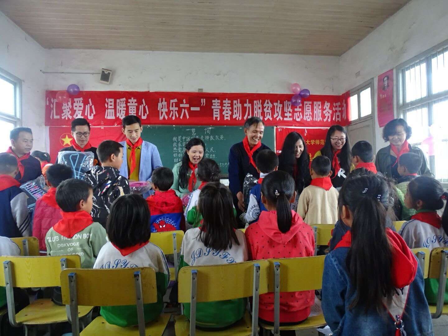 紧紧围绕党政扶贫工作大局,瞄准贫困青少年的需求,深入推进“脱贫攻坚青春建功行动”,助力贫困青少年;带领、鼓励广大团员青年在脱贫攻坚、同步小康战斗中努力奋斗,发挥生力军和突击队作用。习总书记勉励广大少年儿童“从小就要立志向、有梦想、爱学习、爱劳动、爱祖国、热爱人民,努力成长为有知识、有品德、有作为的新一代建设者”。习总书记强调要把社会主义核心价值观基本内容熟记熟背,融化在心灵里,铭刻在脑子里,结合学习和生活等实践不断加深理解,要学习英雄人物、先进人物、美好事物,在学习中养成美好思想追求。要从自己做起,从身边做起,从小事做起,一点一滴积累,养成好思想、好品德。要加强少年儿童理想信念教育,帮助可爱的孩子们扣好人生第一粒扣子。今天特开展本次“汇聚爱心 温暖童心 快乐六一”青春助力脱贫攻坚志愿服务活动,同可爱的小朋友们一起度过快乐而有意义的“六一儿童节”。