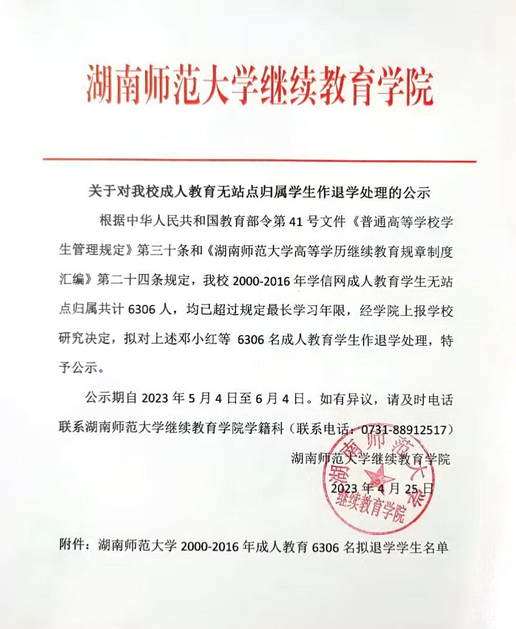 关于对湖南师范大学成人教育无站点归属员工作退学处理的公示
