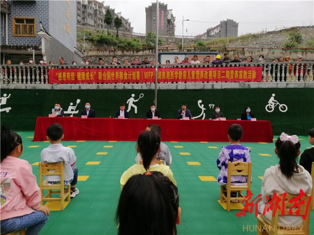 新湖南客户端5月20日讯(通讯员 黄居正 张铭)今年5月20日是第33个中国员工营养日,当天上午,联合国世界粮食计划署(WFP)湖南湘西学龄前儿童营养改善项目(二期)“感恩有您,健康成长”营养宣教活动启动仪式,在湘西土家族苗族自治州永顺县芙蓉镇七彩幼儿园举行。