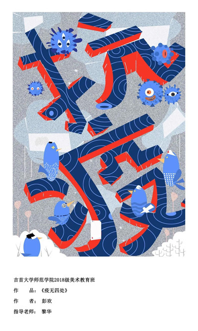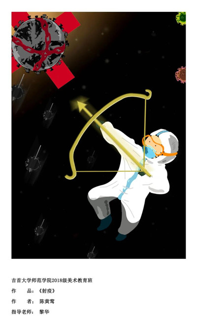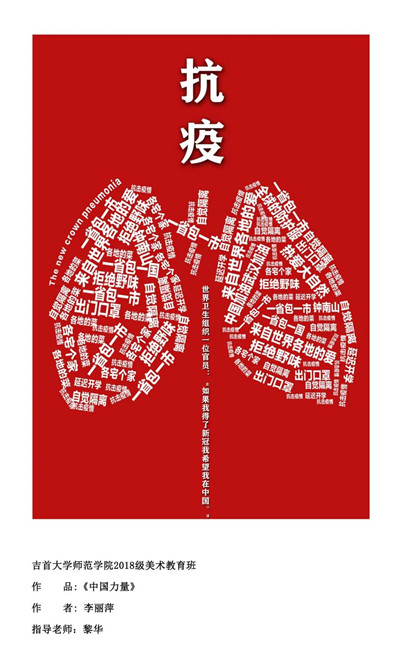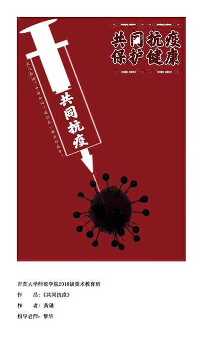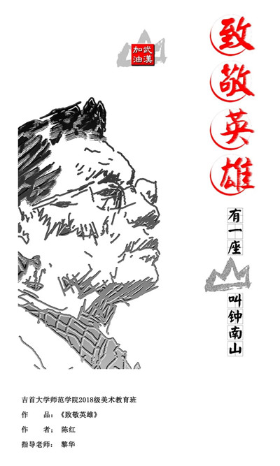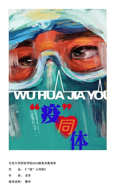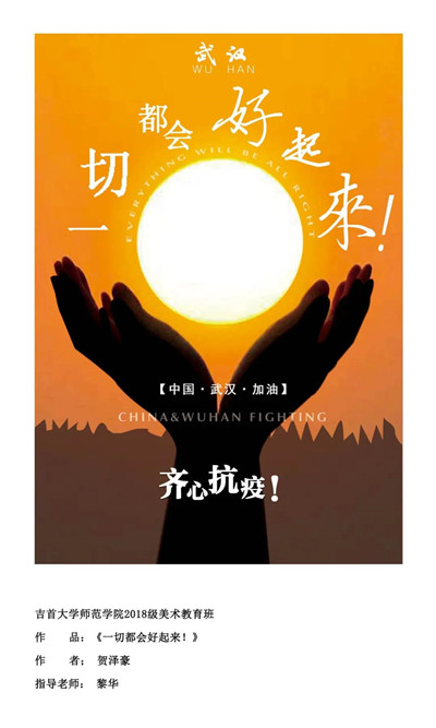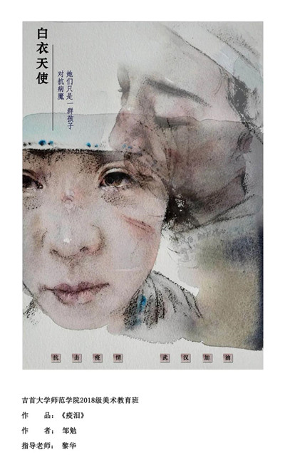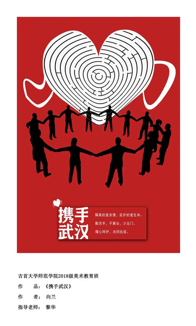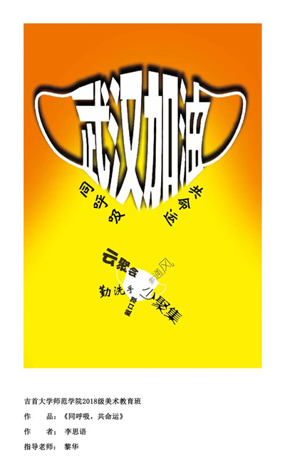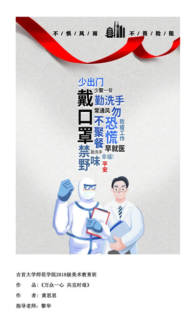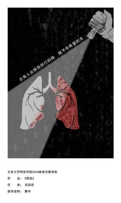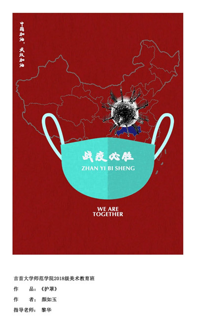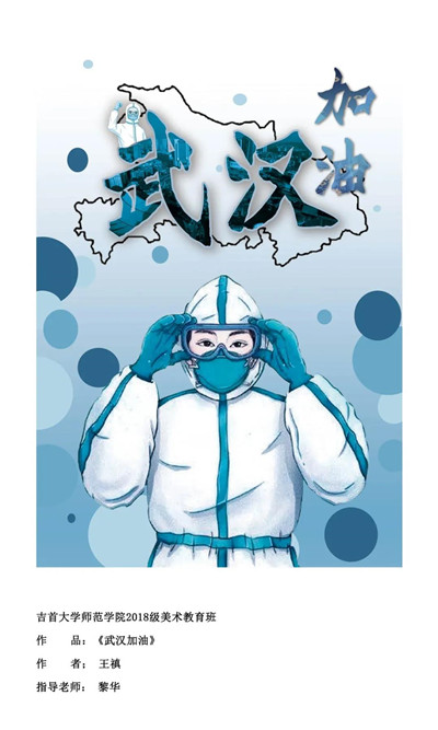 级美术教育班的同学们发挥专业优势,在黎华老师的指导下设计了一组抗击疫情的主题海报。一幅幅海报,都体现了师院学子共同抗疫的责任担当,凝聚了他们对逆行者的崇高敬意以及对祖国的美好祝福。