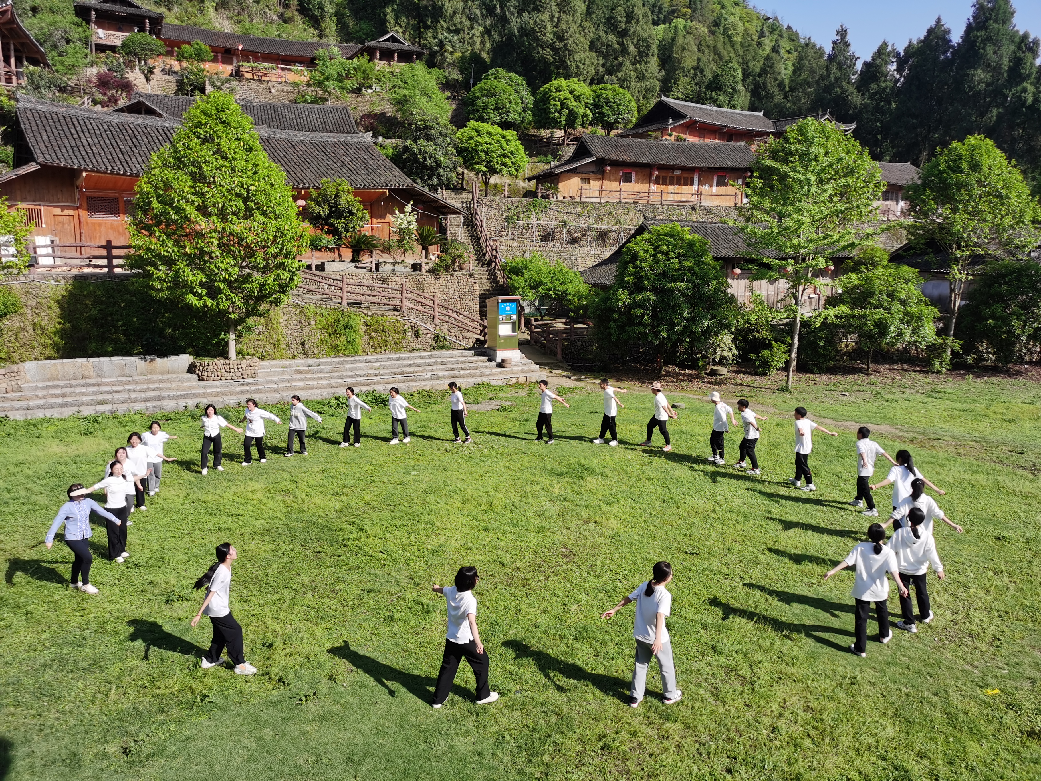 在摆手堂前,同学们还兴致勃勃地学习了土家族的传统舞蹈——土家摆手舞,亲身体验土家族民间舞蹈的独特魅力。