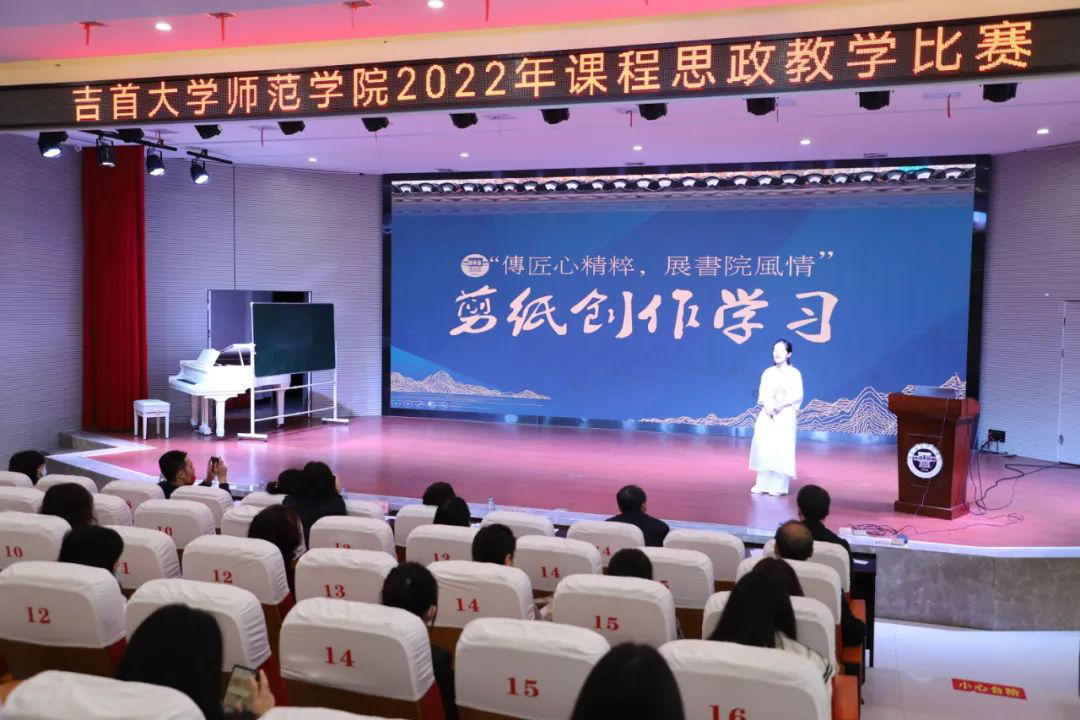 各参赛队伍对所选课程从课程思路到课程设计再到片段教学展示进行了精彩的说课汇报和模拟教学。初教系《语文》课程以诺贝尔获奖者莫言《卖白菜》一文为切入点,充分融合社会主义核心价值观“诚信”主题,讲述在特殊年代里农民生活的艰辛与酸楚,但压不垮的脊梁支撑了一代又一代人。艺术系《手工》课程以潕溪书院为素材进行手工剪纸创作,将潕溪书院为标志的中华民族优秀传统文化融入到师范教育中,将课程、思政、传统文化有机结合起来。现场教师的温情展示更是引起观众的称赞和共鸣。
