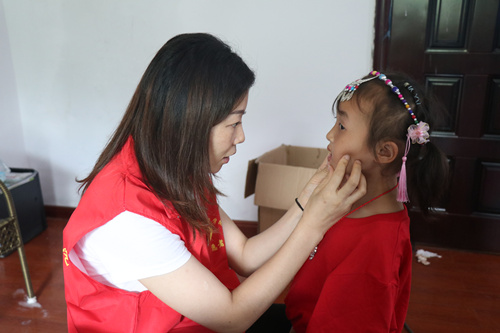 公司校医在给留守儿童检查口腔