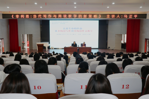 讲座伊始,马正平教授为我们讲解了“构思性写作”与“非构思性写作”两种写作思维方式和具体含义:“构思性写作”是一种从“理性预设构思”到“行文表达”的写作状态,“非构思性写作”更加注重的是思维逻辑性以及语言的表达能力,具有真实性与自由性。马正平教授将两种写作思维进行了对比,强调了“非构思性写作”的重要性。在讲座中,马正平教授提出了“赋行思维”的概念,通过“重复”与“对比”这两种写作赋形和焦文林、王立根对赋形思维的评价阐释了概念。接着,马正平教授对记叙文非构思性写作进行分析,他以《沙尘暴》为例,表现了“重复”的强化、渲染、浓郁等作用。