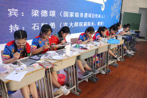 随后,40余名师生代表在院报告厅跟随梁德颂老师现场制作苗画。学习人员现场制作的种类繁多,团扇、折扇、布袋、小苗鼓、铃鼓、手机壳、包包、衣服、大小装饰画等等。梁老师在现场用勾线笔和丙烯颜料在白布上勾画苗画初稿,之后,按照不同的材质分组展示了苗画中线条的运用、颜色的搭配以及颜色的渐变等苗画中的重要技巧,流畅又娴熟的笔触和手法惊艳了所有现场人员。